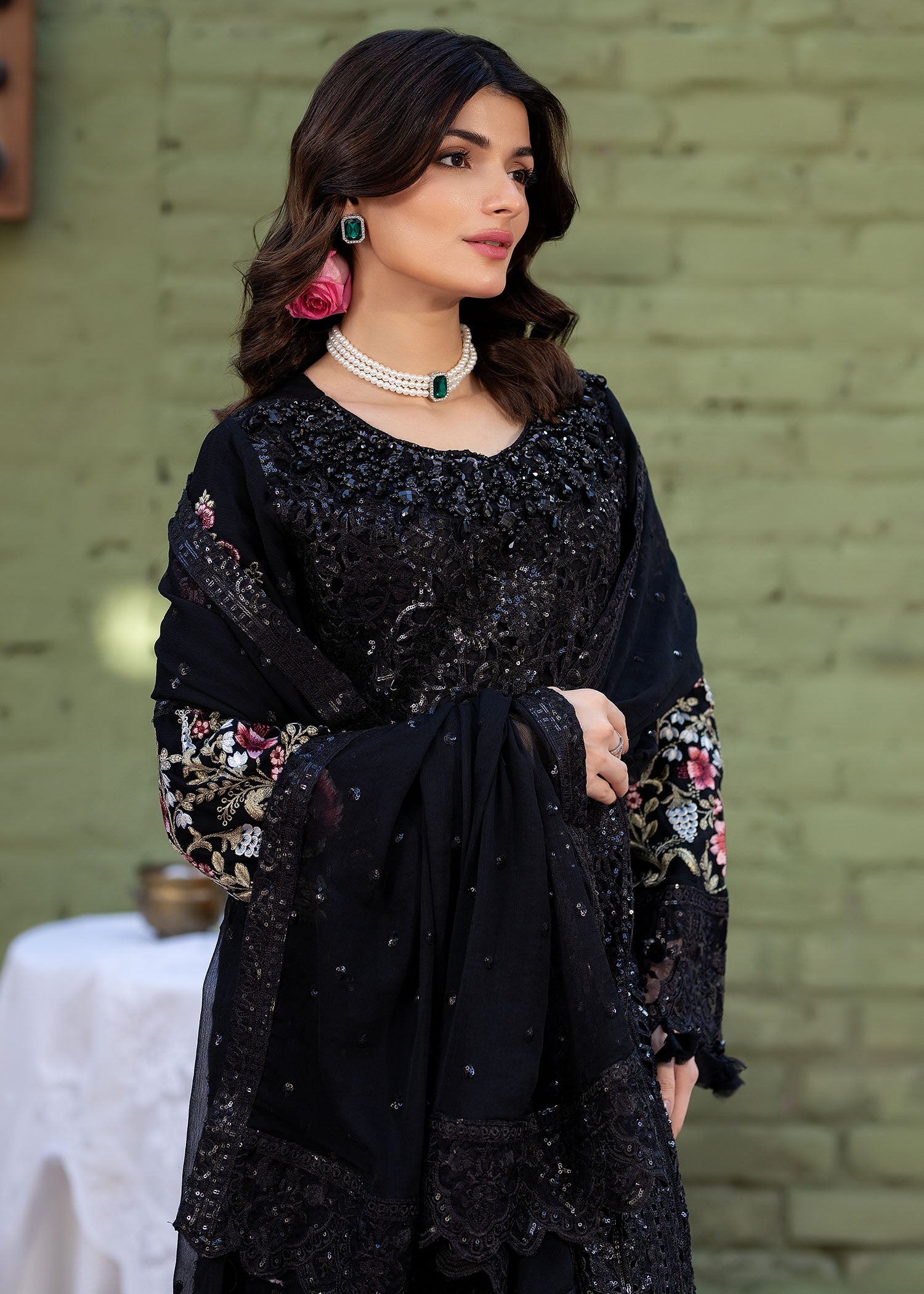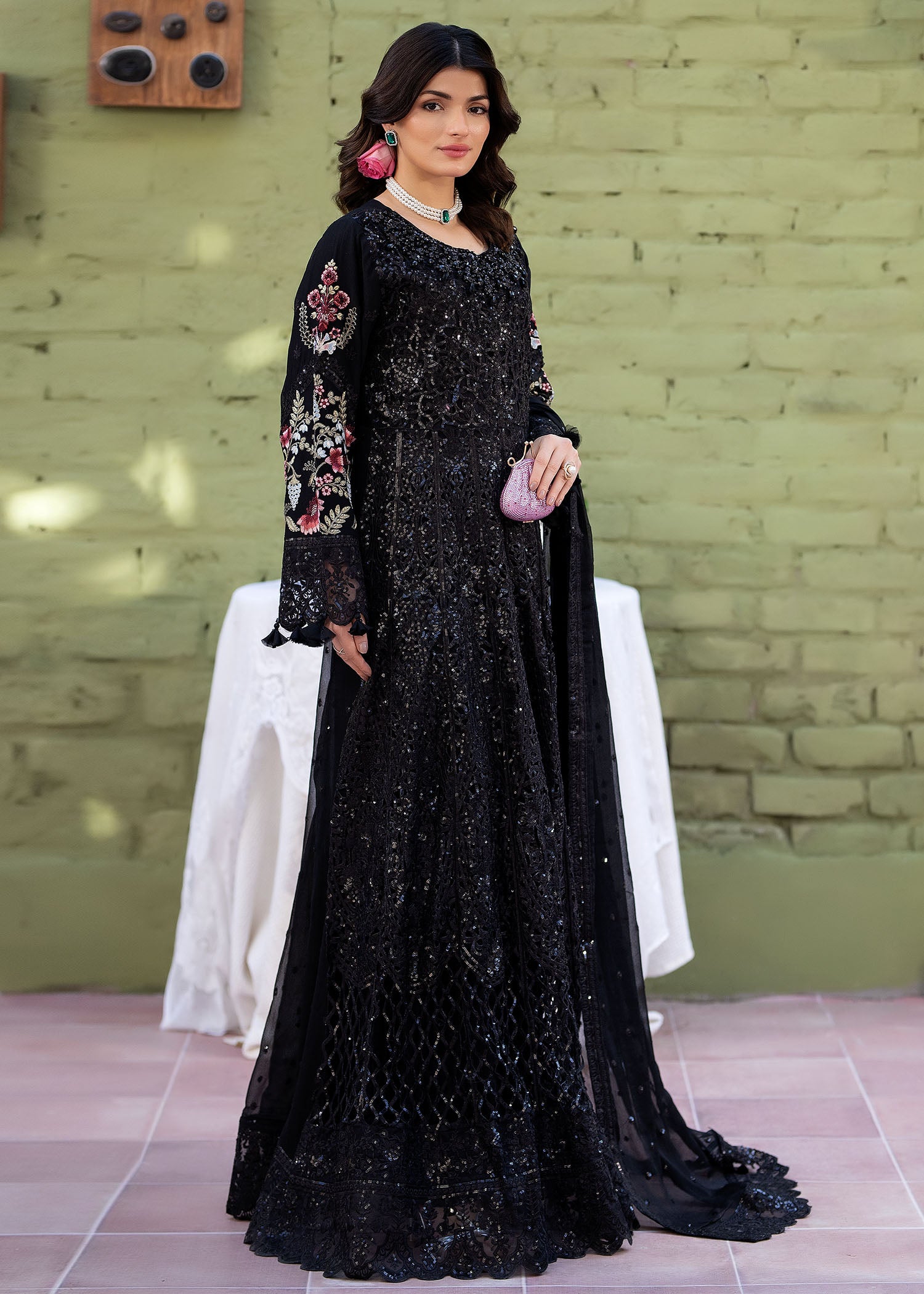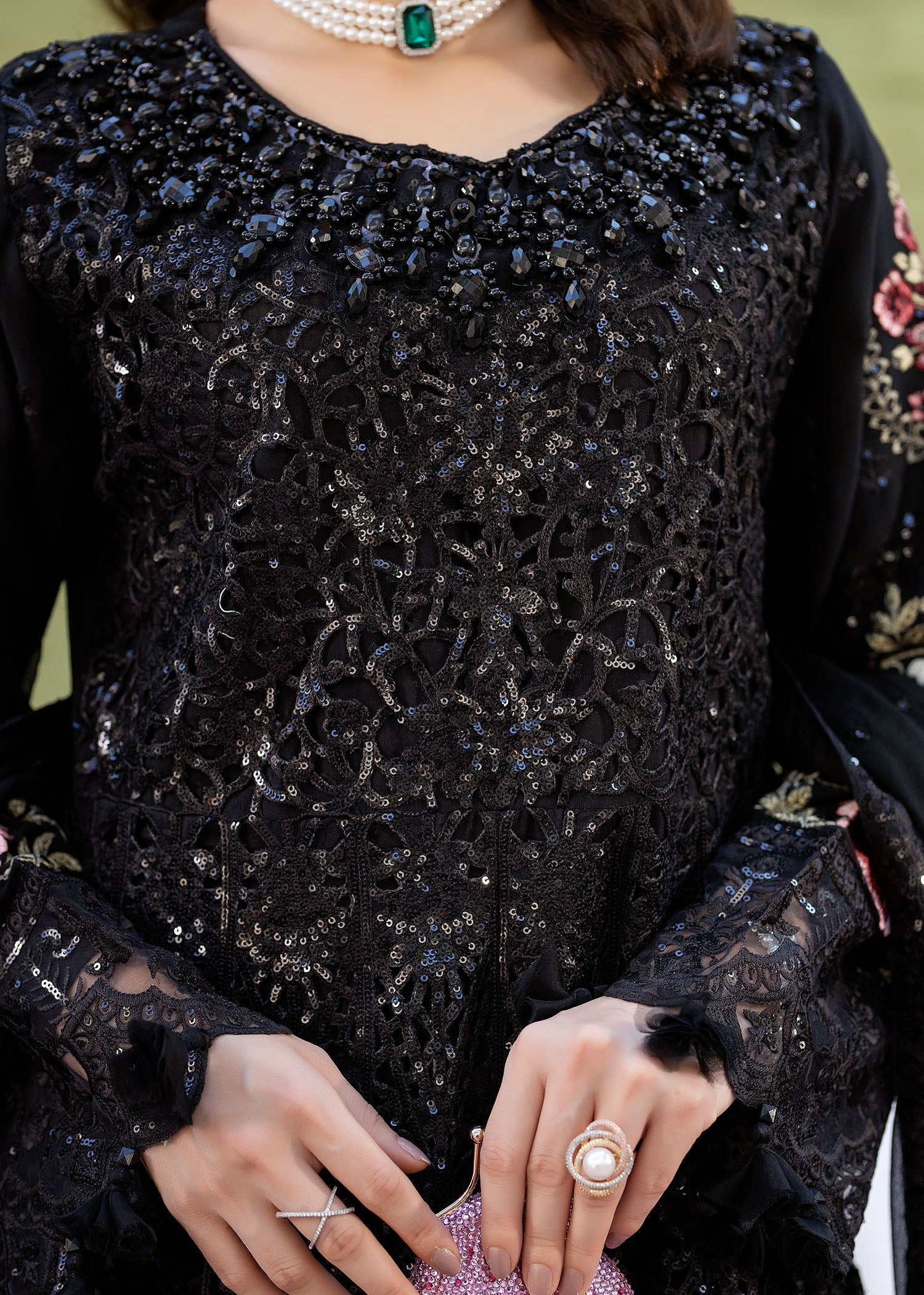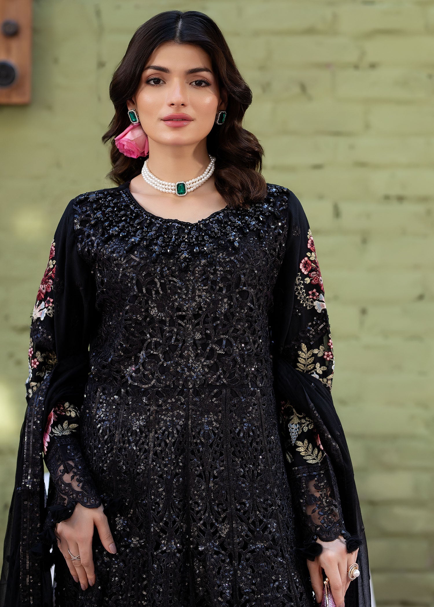 A stunning black maxi showcasing intricate laser cutwork with delicate adda detailing along the neckline. Embroidered organza borders enhance the hem and sleeves, complemented by embroidered chiffon sleeves and back. Paired with straight raw silk trousers for an effortlessly elegant look.