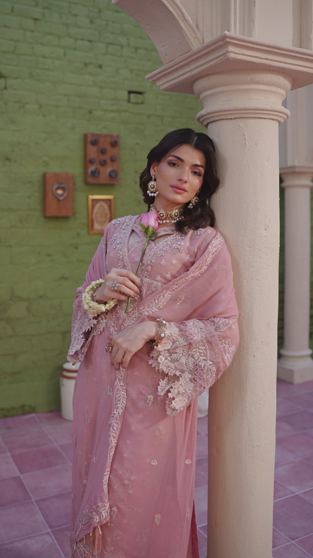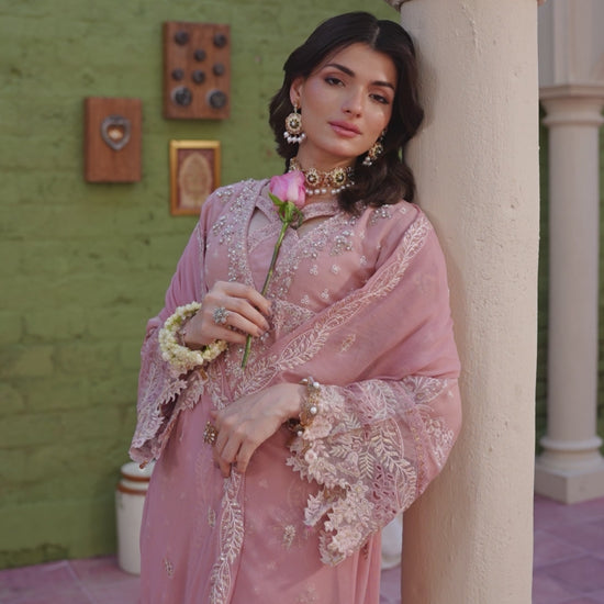 Elegance personified! This exquisite straight-cut shirt is crafted from embroidered chiffon and features fully adda work on the whole shirt. The sleeves are adorned with beautiful embroidery and an embroidered organza border at the opening. Complete with an embroidered chiffon dupatta featuring an embroidered silk border, and paired with a raw silk crush sharara, this ensemble is perfect for making a statement at any occasion. A stunning addition to your formal wardrobe, guaranteed to turn heads.