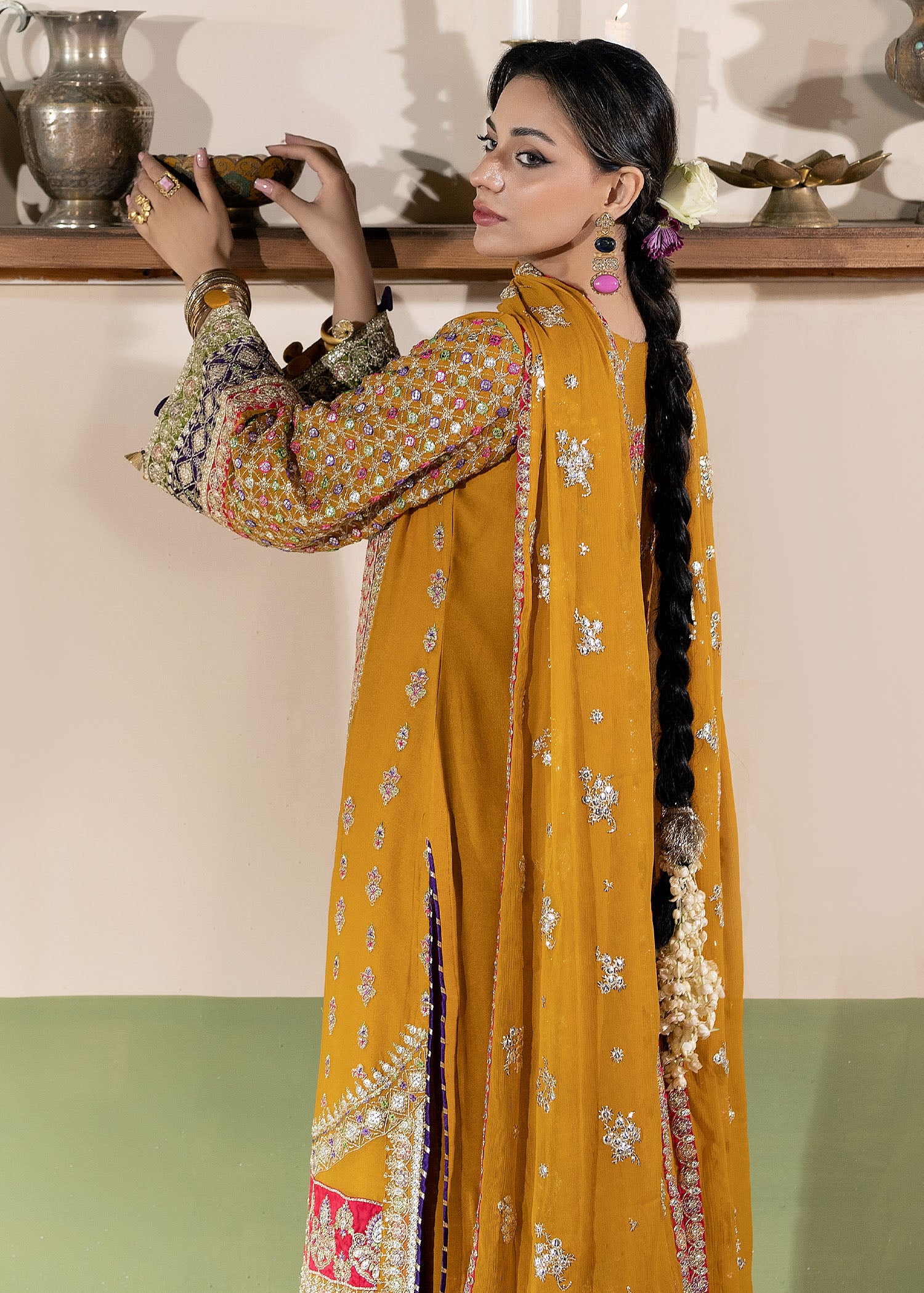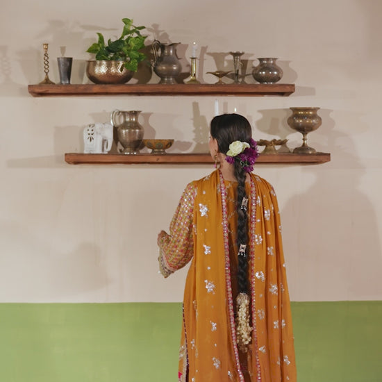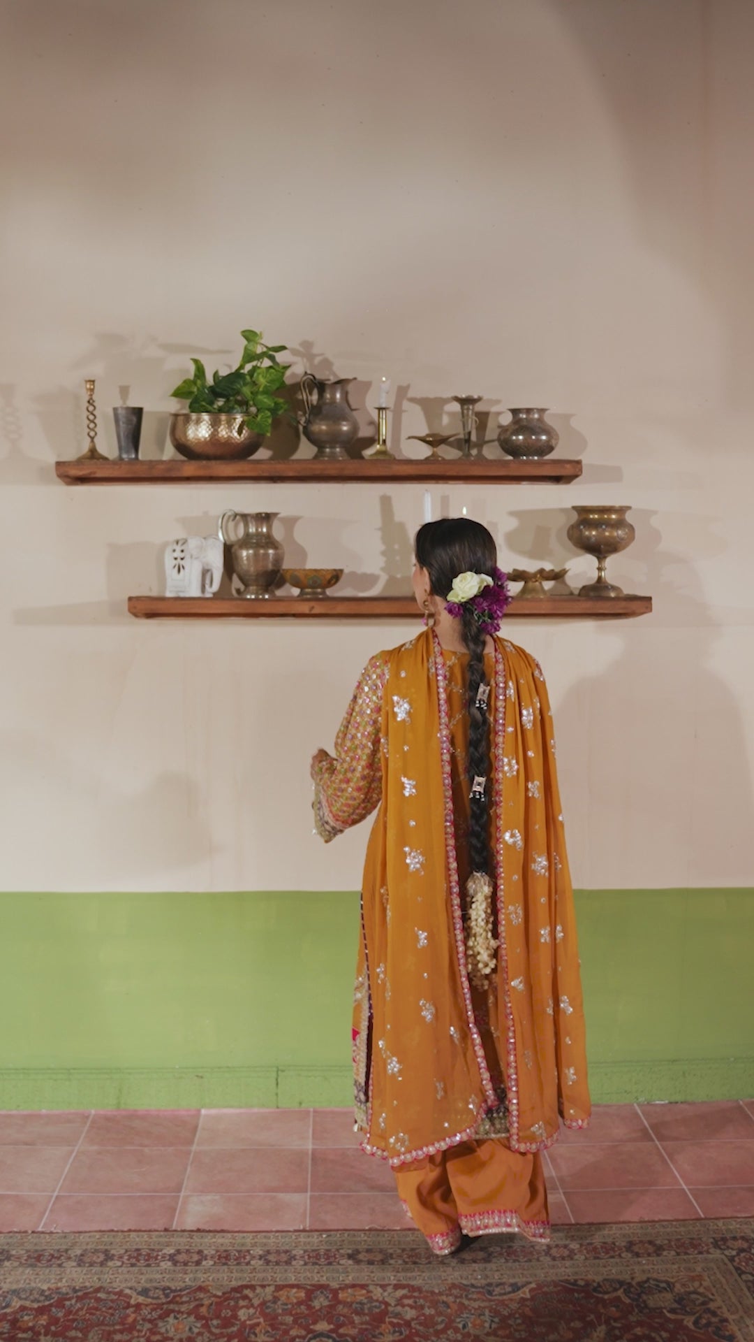 Gracefully detailed in chiffon, this embroidered shirt features a delicately foil-worked neckline and an embroidered silk patch at the daman. The embroidered sleeves add refinement with intricate artistry. Paired with an embroidered chiffon dupatta finished with a silk embroidered border and a PK raw silk plazo for a polished, timeless look.