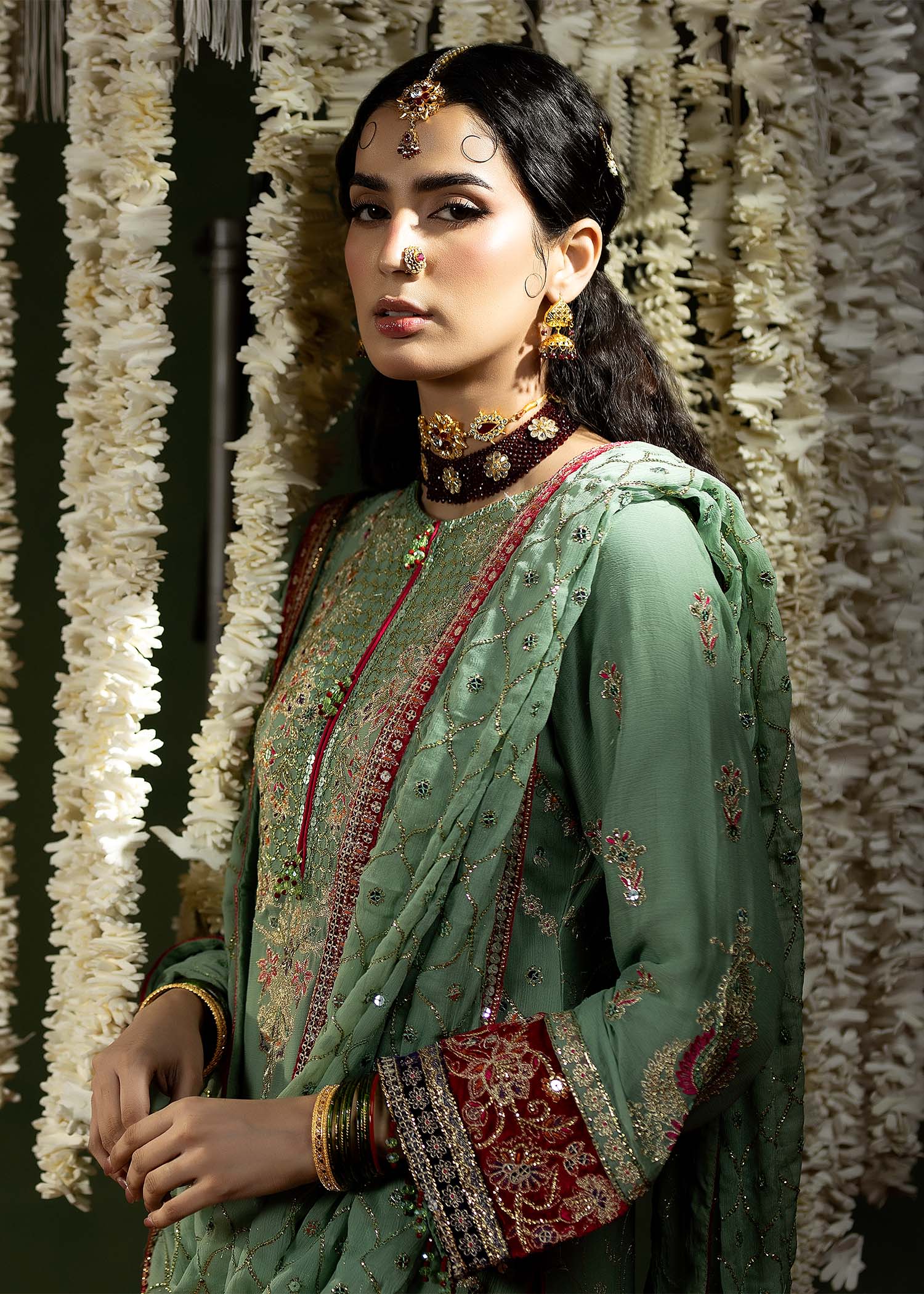 Dupatta: Embroidered chiffon dupatta with an embroidered velvet border.